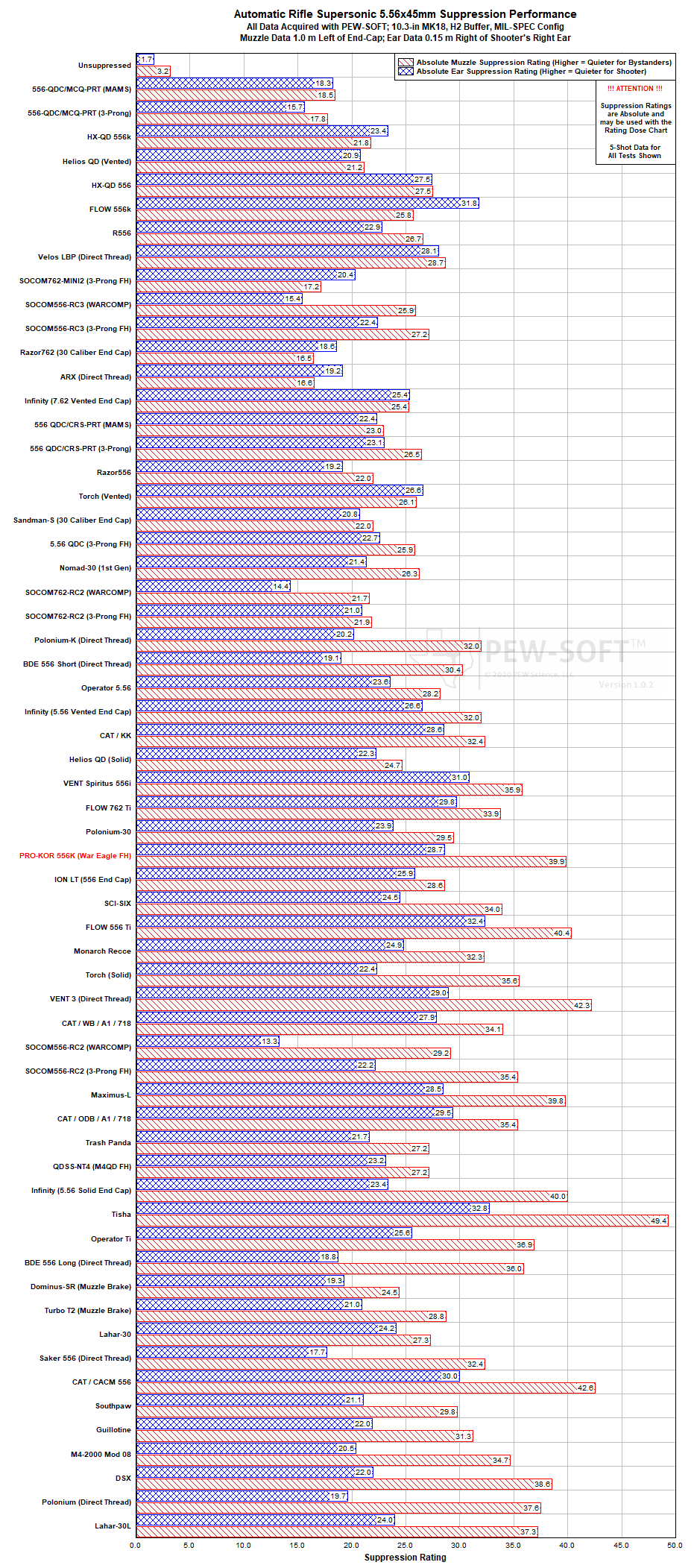 Figure 6. Suppression Rating Comparisons of the JK Armament PRO-KOR 556K and other rifle silencers, Using PEW-SOFT 5.56x45mm Supersonic Test Data and PEW Science Analysis