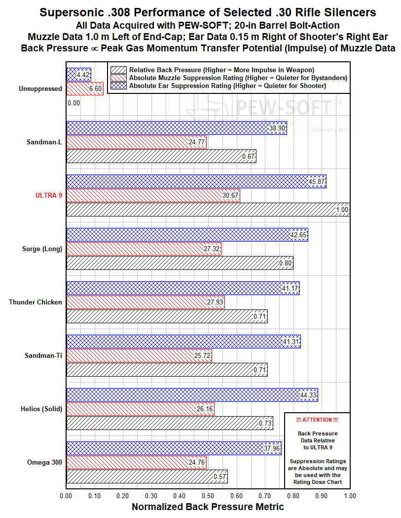 The ULTRA 9 suppressor is intended to be a lightweight precision bolt-action rifle silencer with high sound suppression performance, without regard for back pressure. PEW Science is currently conducting silencer back pressure research. Figure 7 shows preliminary relative supersonic suppression and back pressure comparisons between selected 7.62mm (30 caliber) rifle silencers shown in public PEW Science Sound Signature Reviews, as of the date of this review publication. The results shown in Figure 7 are calculated from real test data acquired with PEW-SOFT. Please note the following: